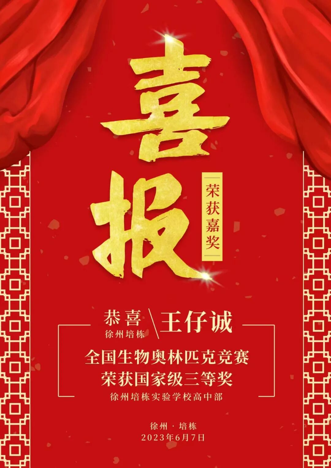喜报 | 徐州培栋实验学校 高中部王仔诚同学荣获全国生物奥林匹克竞赛国家级三等奖